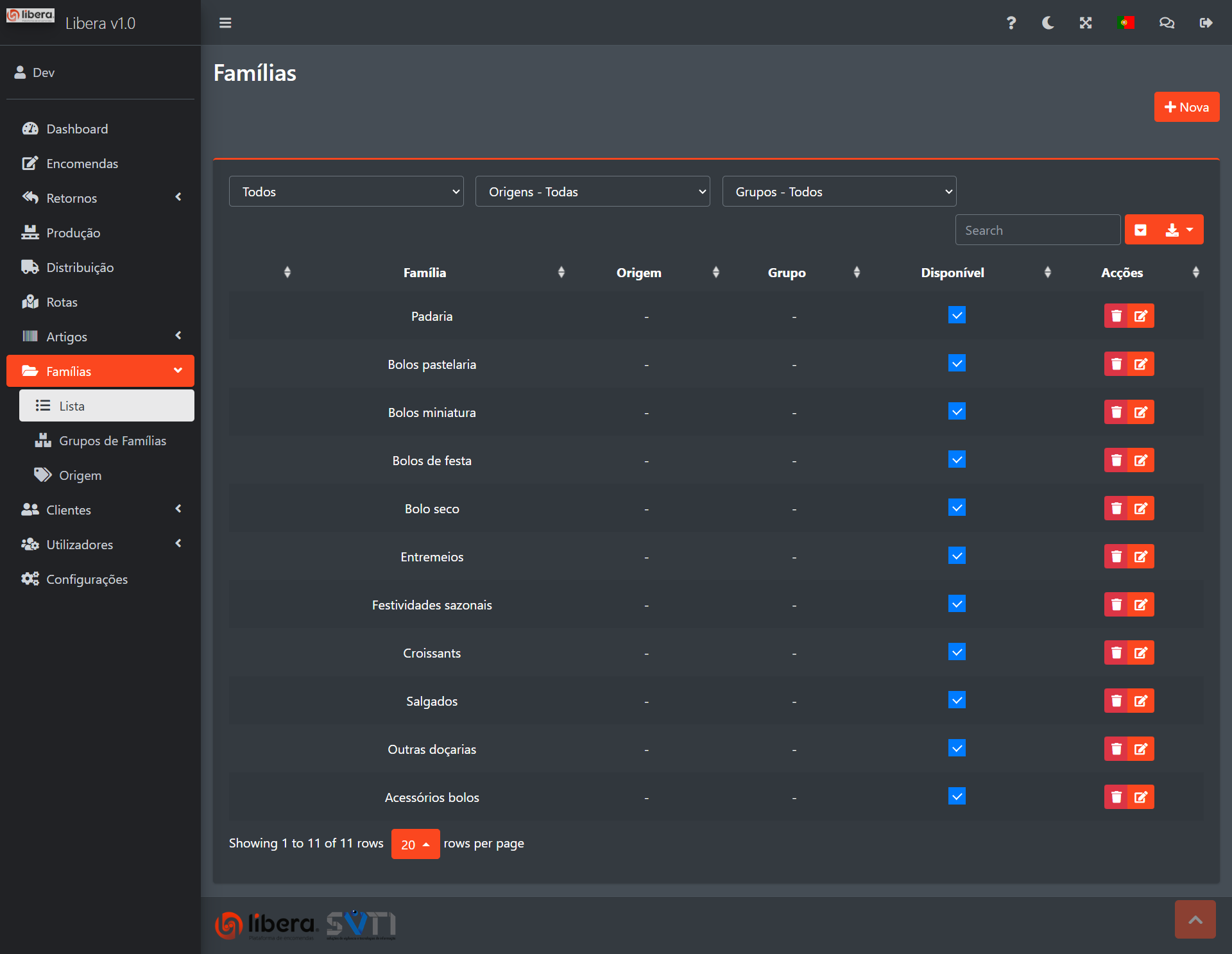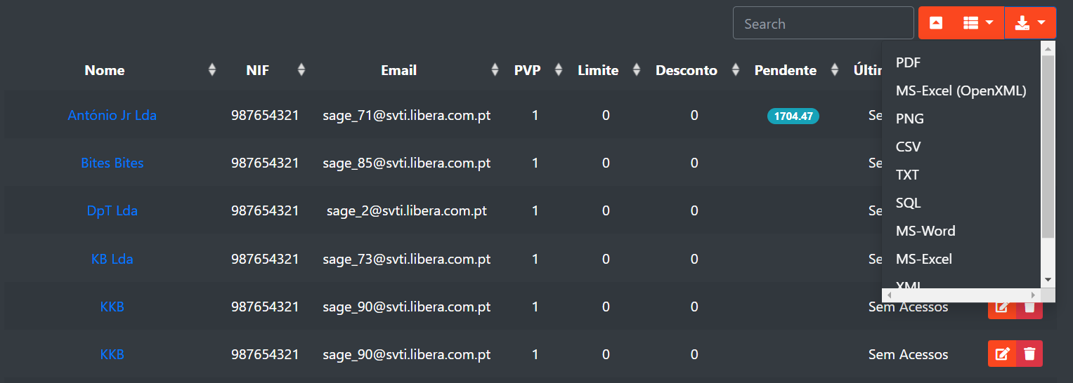 - Permite a exportação em vários formatos dos campos visíveis da tabela