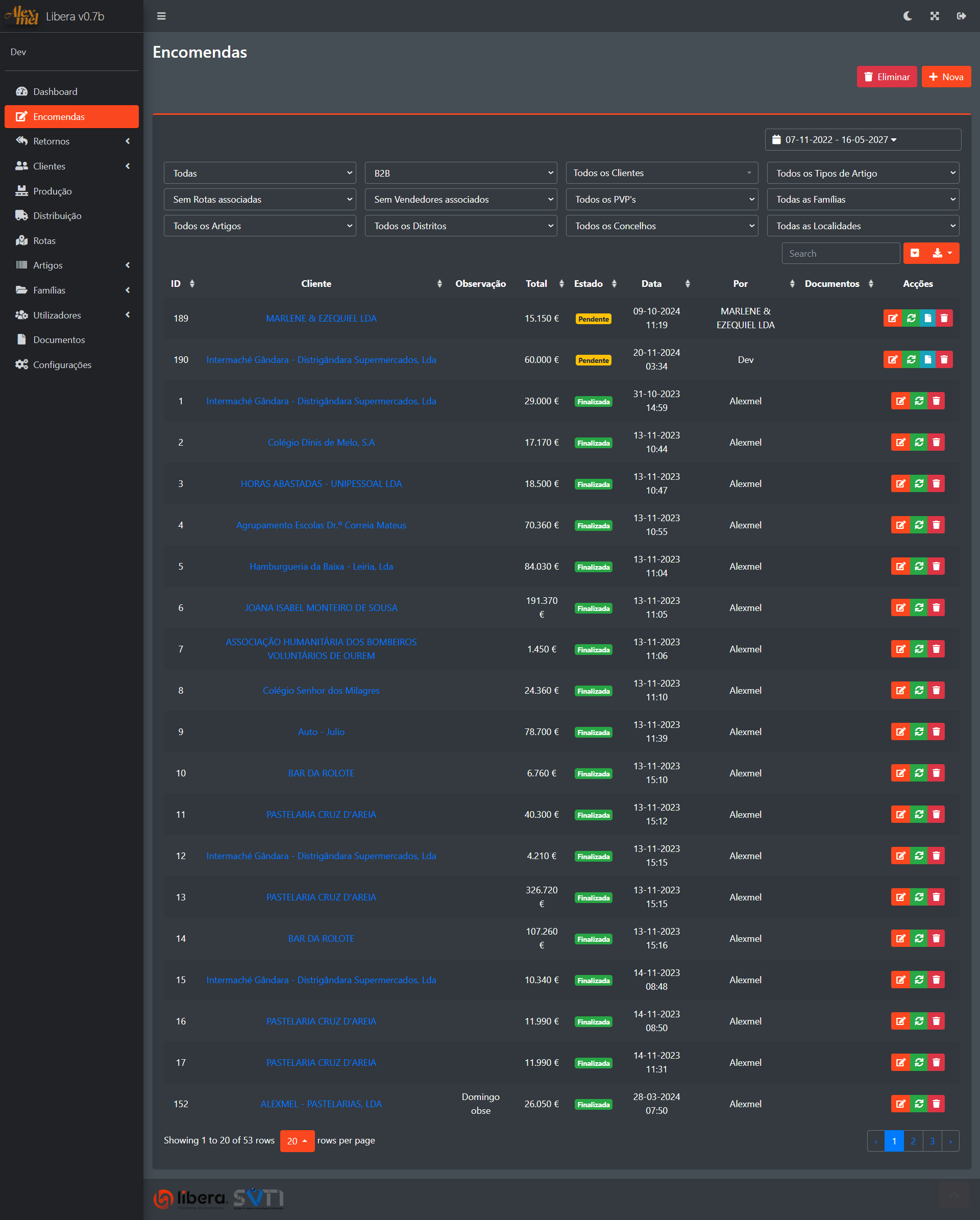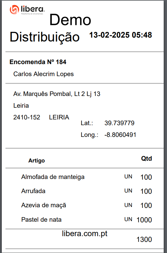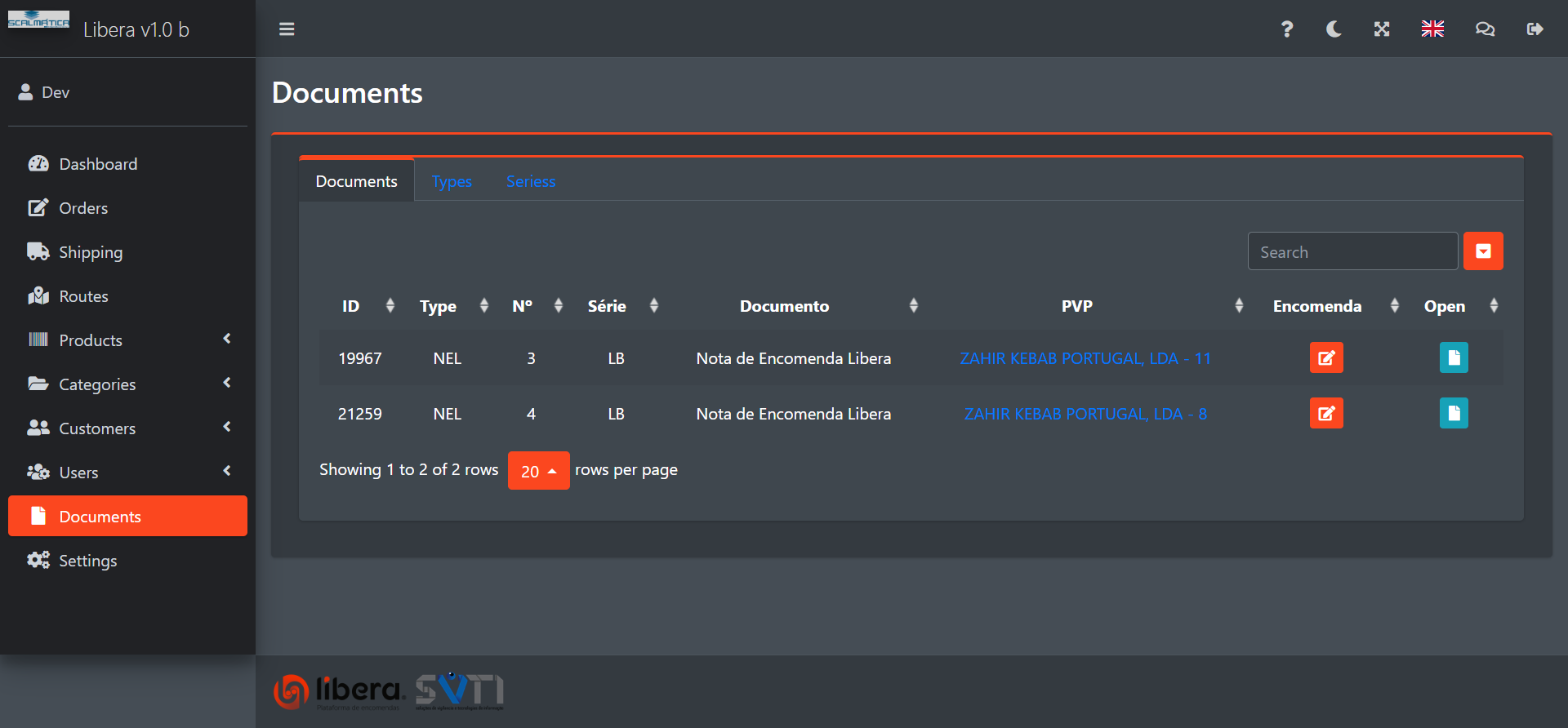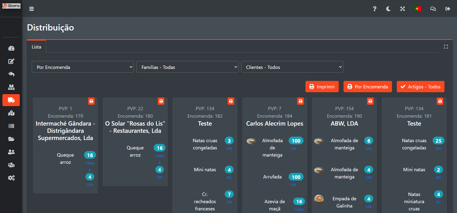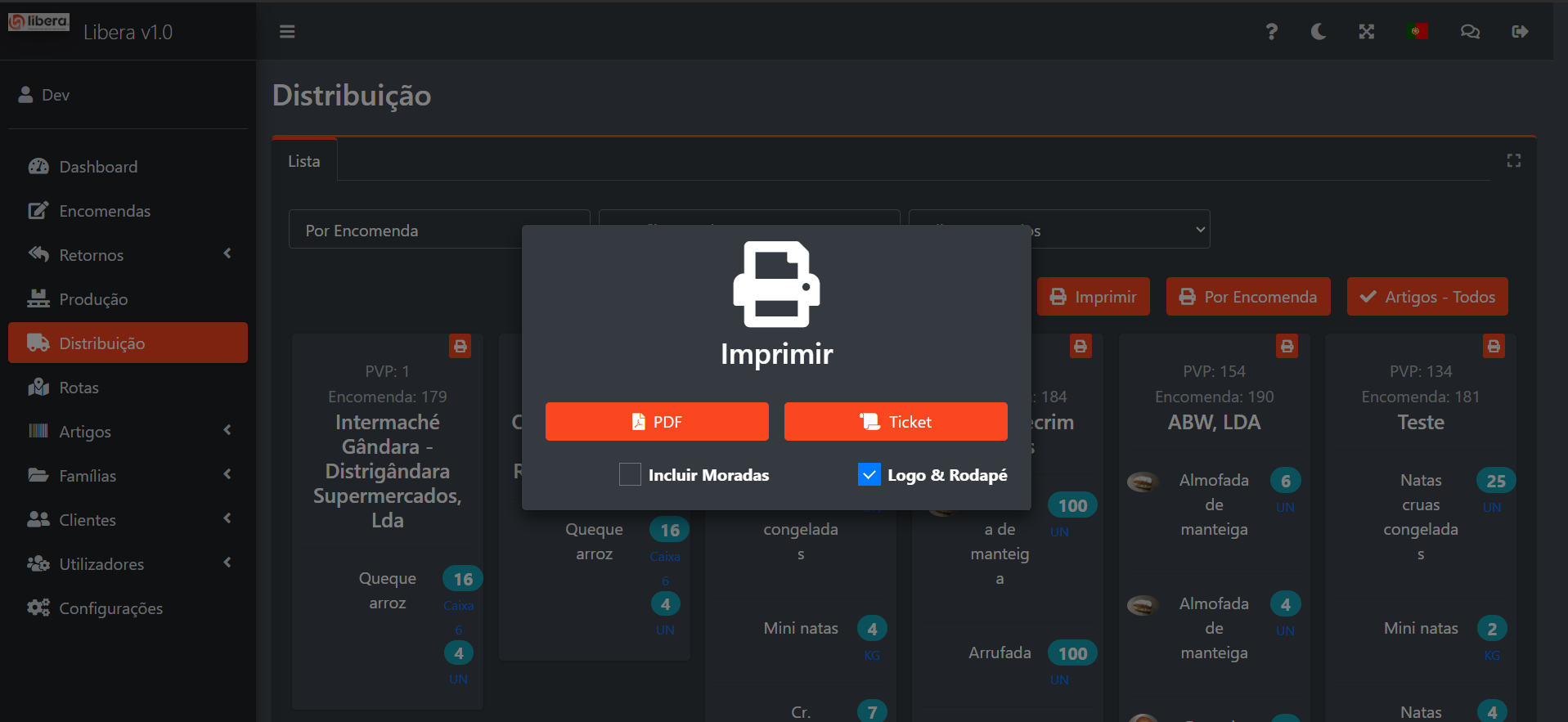 - Acção para emitir documentos relacionados com a encomenda, como Notas de Encomenda, Faturas, Guias de Transporte, etc.