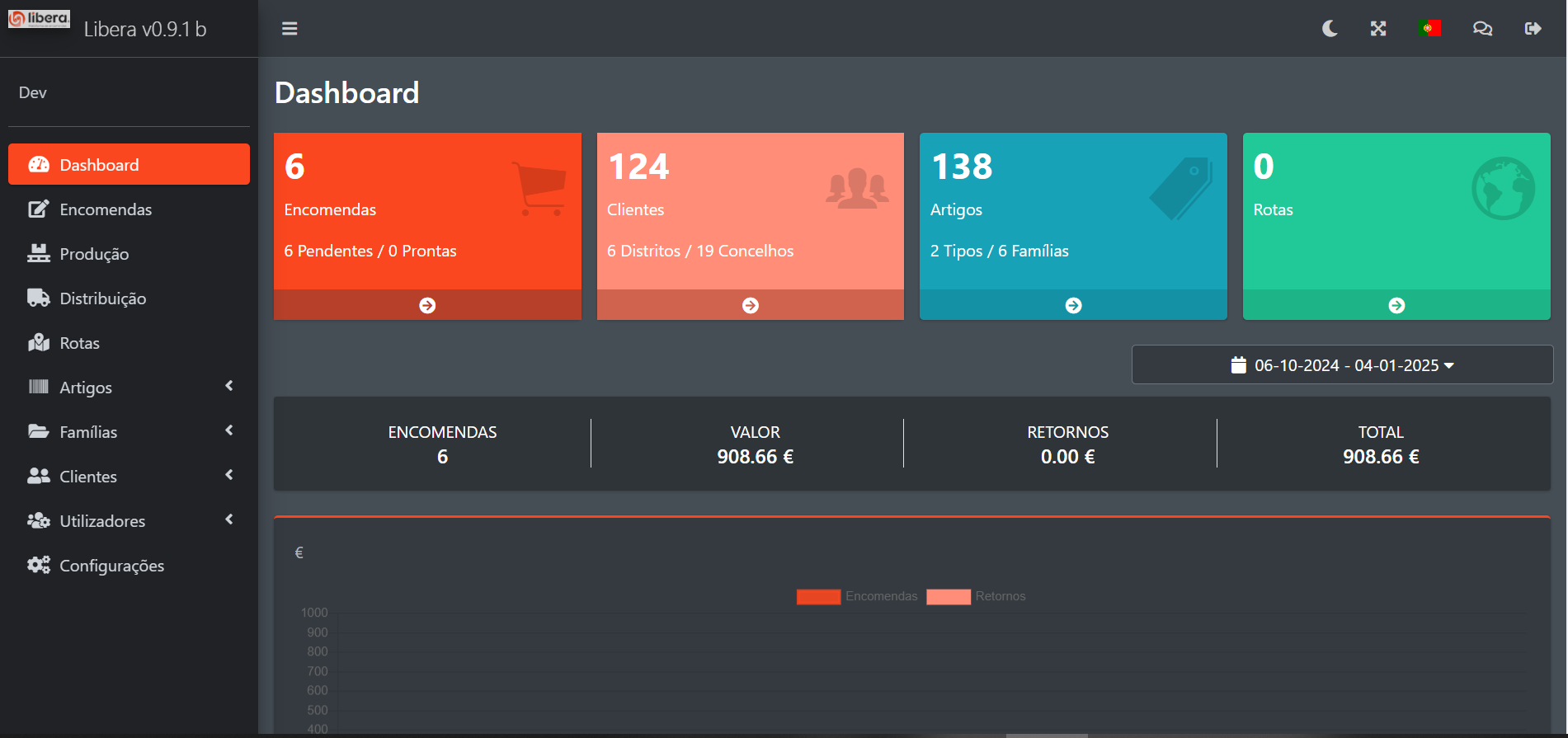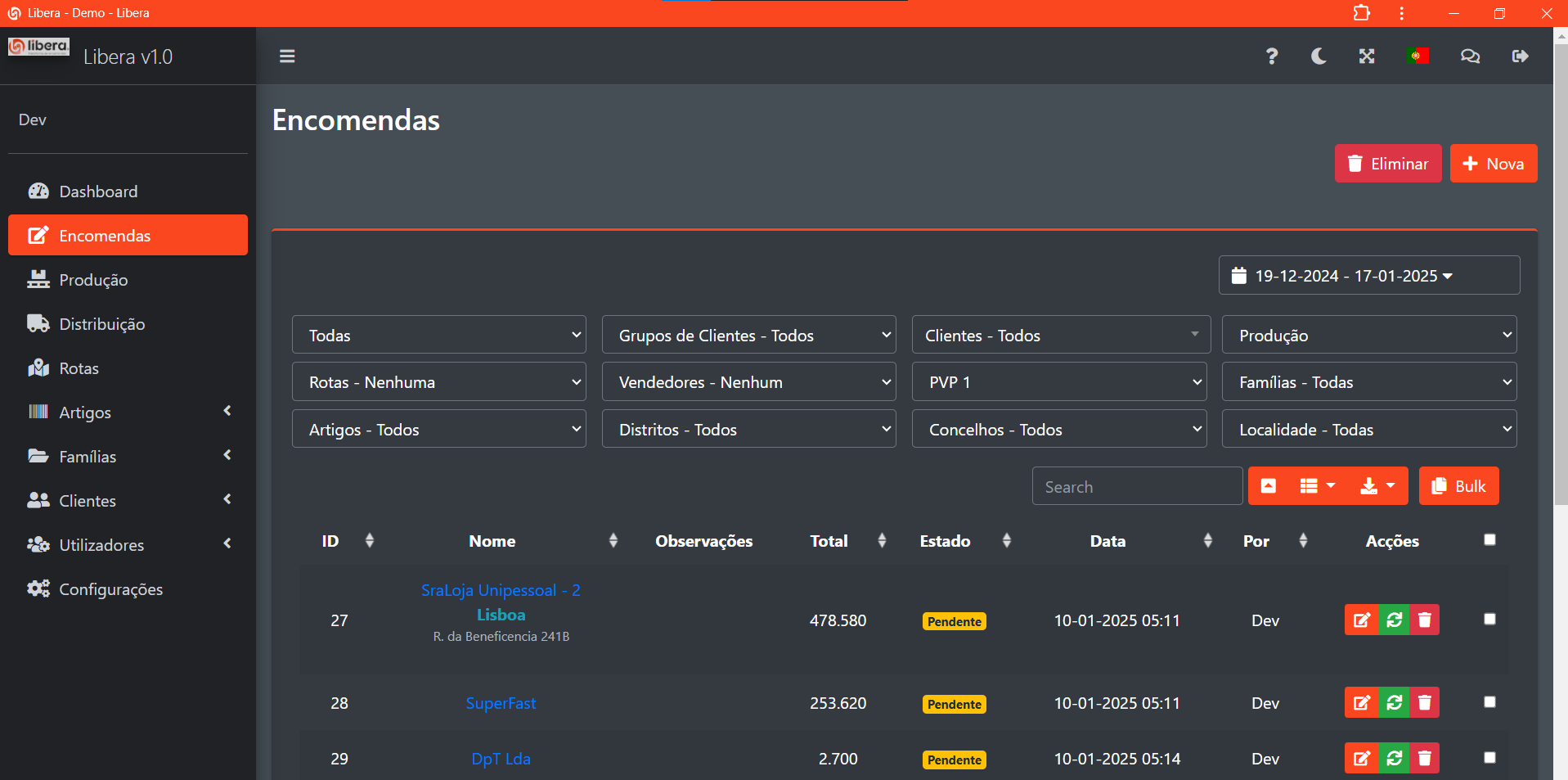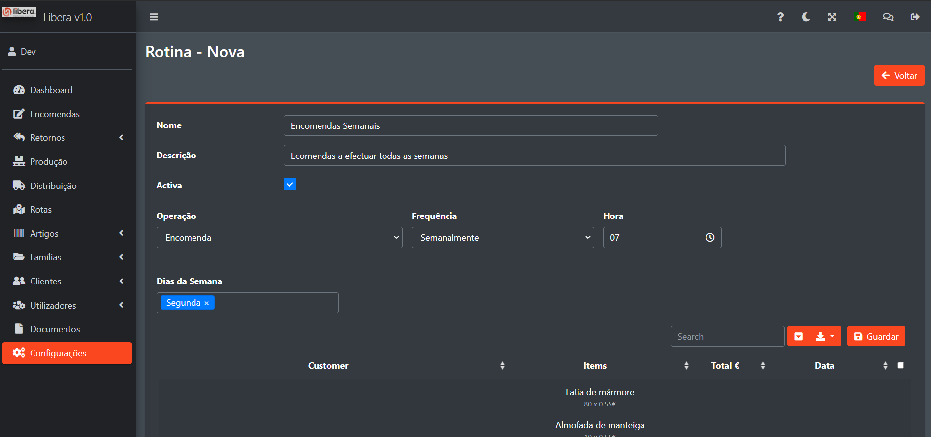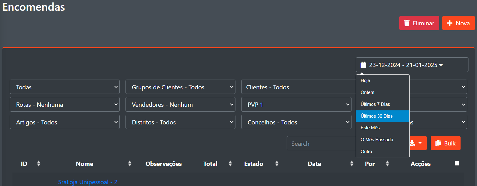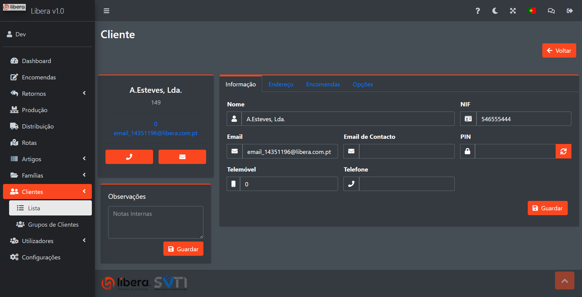 - Acção para emitir documentos relacionados com a encomenda, como Notas de Encomenda, Faturas, Guias de Transporte, etc.