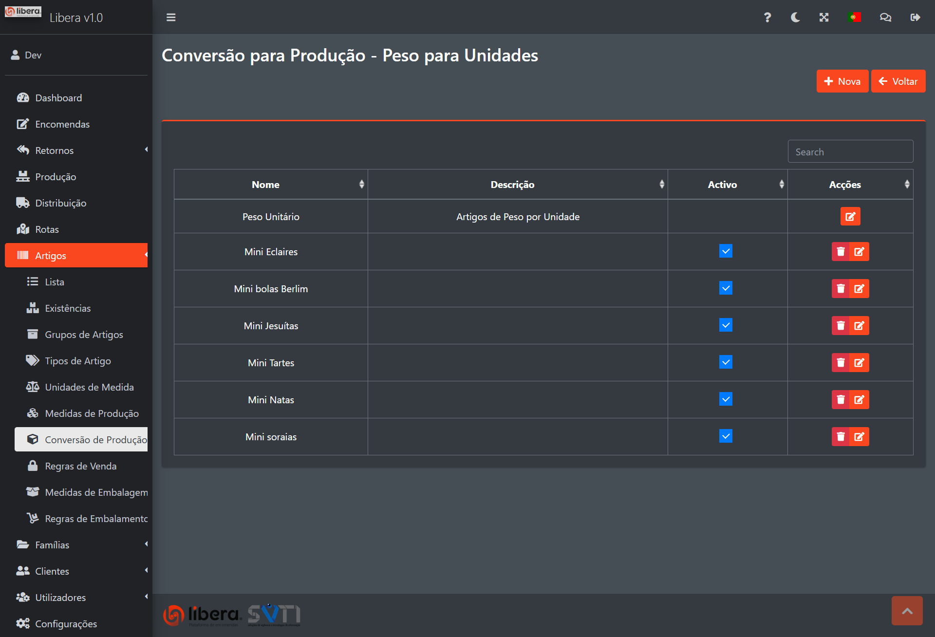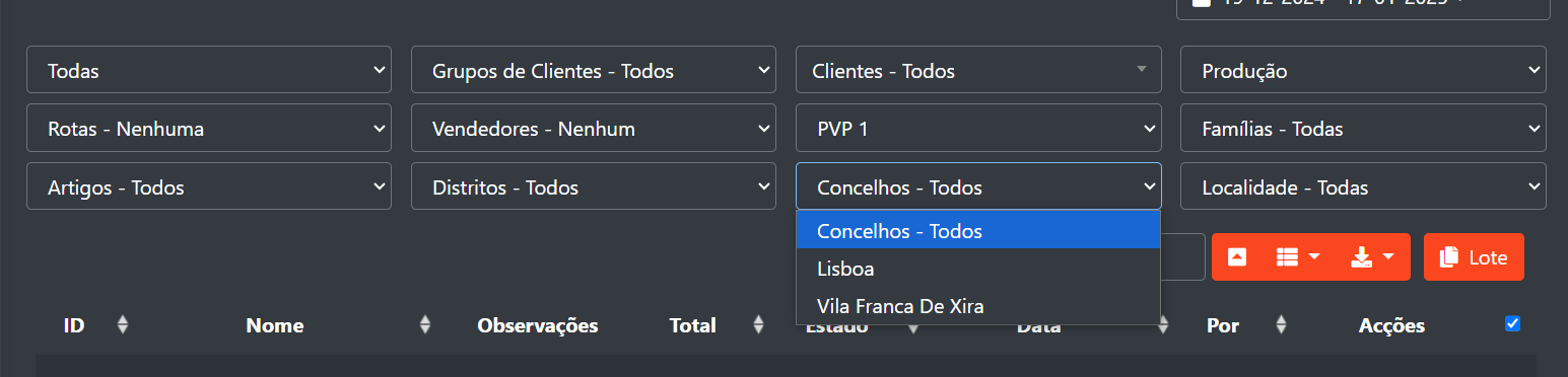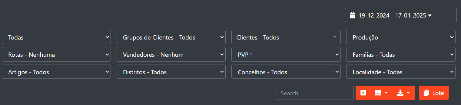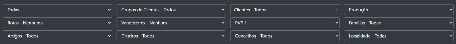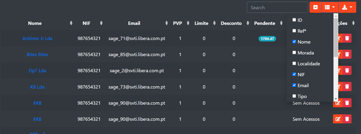 - Define os campos visíveis na tabela. Útil para impressão ou exportação em ficheiro.